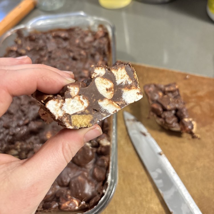 Born out of necessity. Em loves a classic butterscotch chip square but the only vegan chips in our pantry are chocolate. And wouldn’t those church squares also be improved with a little crunch?